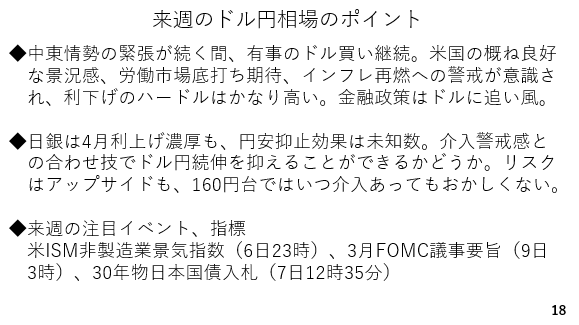 来週のドル円相場のポイントです。依然として中東情勢睨みとなりますが、緊張が続く限り、ドルは底堅さを維持するでしょう。また、金融政策を巡っても米国の利下げのハードルはかなり高いと考えられ、ドルに追い風です。日銀については、4月利上げが濃厚ですが、ある程度、織り込みが進んでいることから円安を抑える効果はかなり限定的となりそうです。
