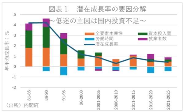 まず、高市政権が直視している『基本認識』についての説明である。日本には、世界に誇る技術革新力や労働の効率性という素晴らしい底力がある。その傍証として、日本経済の潜在成長率を要因分解すると、全要素生産性の伸びは健闘している。しかし、長年、国内投資の不足と労働時間の減少によって、その潜在成長率は低迷したままである(図表1)。