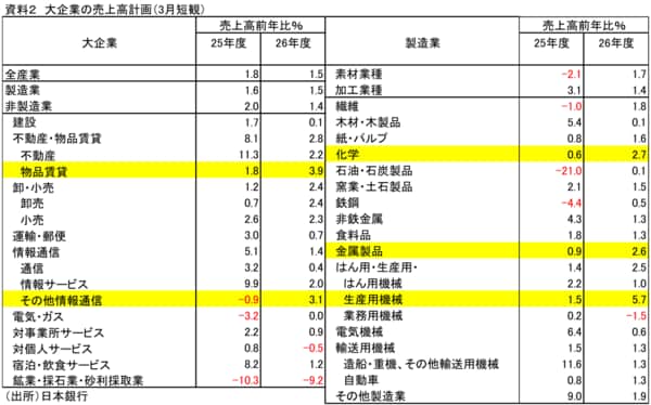 続いて、3月短観の売上高計画を基に、大幅増収が見込まれる業種を選定してみたい。資料2は25・26年度の業種別売上高計画の前年比をまとめたものである。