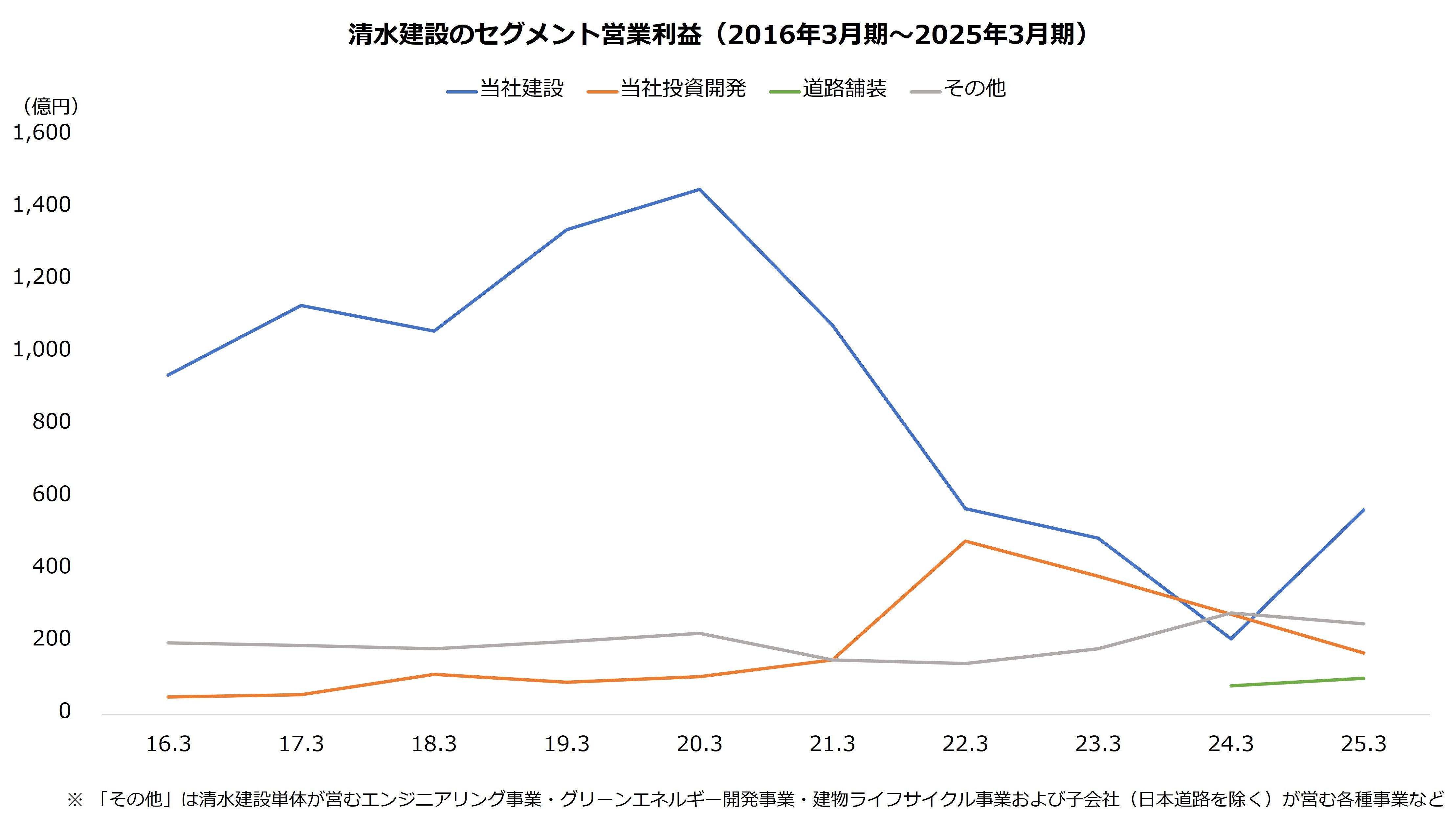 清水建設の利益構成は、かつて建設事業が大部分を占めていました。しかし、現在は不動産開発の「当社投資開発」や、再生可能エネルギーを含む「その他」の比率が上昇しています。建設事業の立て直しを進めると同時に、建設以外への投資を強めることで全体の成長を目指します。