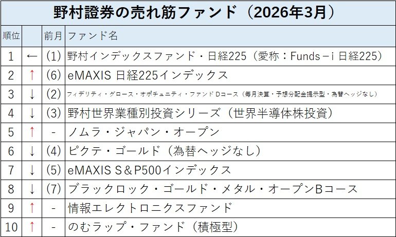 野村證券の投信(ファンド)人気ランキング2026年2月の買付金額トップは前月と同様に「野村インデックスファンド・日経225(愛称:Funds-i 日経225)」だった。同ファンドは2025年10月以来6カ月連続でトップをキープしている。第2位には前月第6位だった「eMAXIS 日経225インデックス」が浮上した。また、トップ10圏外から第5位に「ノムラ・ジャパン・オープン」、第9位に「情報エレクトロニクスファンド」がランクインするなど、国内株ファンドの人気が高まっている。一方で米国株ファンドの人気は衰え、「eMAXIS S&P500インデックス」は前月の第5位から第7位に後退し、前月第8位だった「フィデリティ・米国株式ファンドDコース(分配重視型・為替ヘッジなし)」、第9位だった「東京海上・宇宙関連株式ファンド(為替ヘッジなし)」、第10位だった「アライアンス・バーンスタイン・米国成長株投信Dコース毎月決算型(為替ヘッジなし)予想分配金提示型」はトップ10から落ちた。