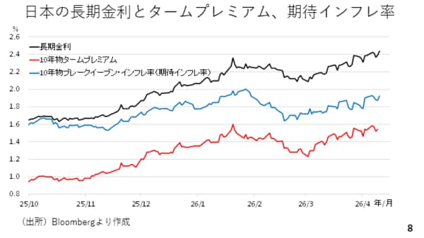 今週、日本国債の10年物タームプレミアムが拡大し、1月下旬の水準にほぼ並びました。タームプレミアムとは債券の投資家が価格変動リスクに対して求める対価とされており、「悪い金利上昇」の一種とみなされることもあります。昨年の秋以降、市場では高市政権の掲げる「責任ある積極財政」を受けて、長期金利上昇と円安が同時に進んできました。今後、似たような動きが再燃する可能性に留意が必要です(スライド8)。