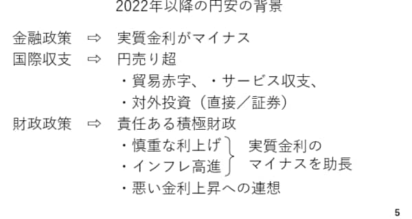 加えて、「責任ある積極財政」を巡り、市場ではいわゆる「悪い金利上昇」と通貨安が連想された面もあります。結局、円のこうした弱点が克服されない限り、ドルが安くなったからといって円高にはならないと考えられます(スライド5)。