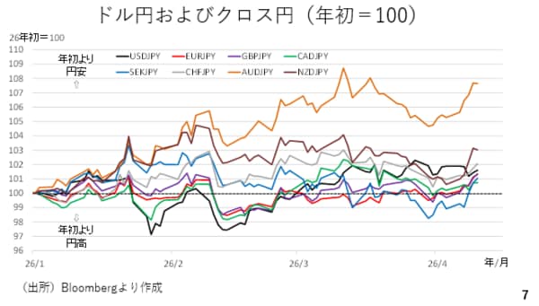 実際、市場では今月の日銀の利上げが6割程度も織り込まれていますが、今週はリスク回避姿勢の緩和によって、幅広い通貨に対して円安が進みました。特にユーロ円については186円87銭という史上最高値を本日更新しても不思議ではありません(スライド7、実際、4月10日のニューヨーク時間にユーロ円は史上最高値を更新しました)。
