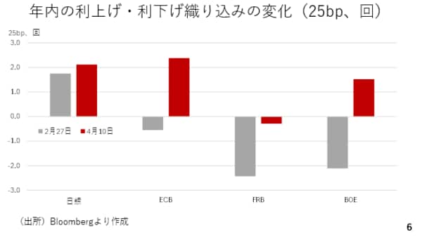 こうした中、これまでの動画でお伝えしてきた通り、今月の金融政策決定会合で日銀が利上げを決定する可能性が高いと考えられます。本来、利上げは円安に歯止めをかけたり、円高への転換を招きますが、二つの理由からそうはなりにくいと考えられます。まず、日銀の利上げがある程度、織り込み済みということです。年初の段階で既に日本のインフレ率に照らし、半年ごとの2回程度の利上げがある程度、織り込まれていました。次に、3月以降、海外中銀の金融政策に対する見方の方が大きく変化しました。例えば、ユーロ圏や英国では2月末まで年内の利下げが織り込まれていましたが、現在は利上げが見込まれています。米国についても2月末の段階で2回以上の利下げ織り込まれていましたが、足元では利下げ観測が大幅に後退しています(スライド6)。