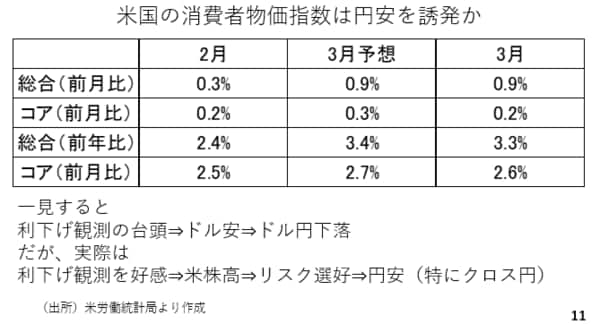 また、本日3月の米消費者物価指数も発表されました。総合、食品とエネルギーを除いたコア指数の前月比、前年比のいずれも予想を下回りました。これを受けて利下げが連想され、先程一時ドル円が159円を割り込みました。但し、実際には利下げ観測が台頭すれば、ドルが軟化するものの、米国の株式相場が上昇すると考えられ、リスク選好の円売りを促します。ドルも円も弱くなるとなれば、これはクロス円が上昇する典型的なパターンです(スライド11)。