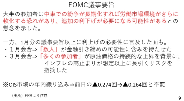 一方、1月分の議事要旨よりも多くの参加者が原油価格の持続的な上昇やインフレ率が長引くリスクを指摘し、利上げの必要性にも言及しています。結局、今回のFOMC議事要旨は、戦争中の先行き不透明感が強い状況の中で、慎重な見方と利上げの必要性とが交錯しており、あまり材料にならなかったと考えられます。実際、議事要旨が公表される前日と当日を比べると、年内利下げの織り込みが0.274回、0.264回とほぼ横ばいです(スライド9)。