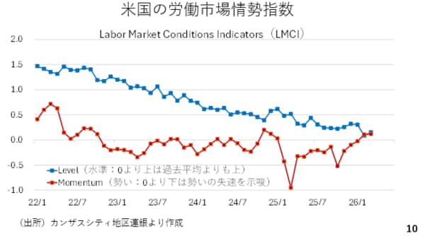 その米国の労働市場について、日本時間8日、カンザスシティー地区連銀が労働市場情勢指数をアップデートしました。これは24種類の労働市場に関連する経済指標を基に算出するものです。このうち労働市場の方向性を示すモメンタムが2月に続いてプラス圏を維持しました。また過去平均と比較した労働市場の水準を示すレベルも2月より改善しています。このLMCIを見る限り、米国の労働市場の悪化に歯止めがかかりつつあると考えられます。このことからFRBは当面様子見姿勢を続けるでしょう。金融政策面でのドル安圧力は生じにくいと考えられます(スライド10)。