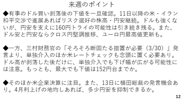 その他では来週以降、本格化する米国の企業決算に注目です。結果に応じてリスクオン、リスクオフを通じ、円相場にも影響が出ると考えられます。また、来週13日に日銀の植田葬祭が発言します。4月の利上げが念頭にあれば、何らかの地均しが出ると思われ、多少円安を抑制することができるかどうかに注目です。