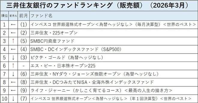 三井住友銀行の投信売れ筋ランキングの2026年3月のトップ2は前月と同じで、トップに「インベスコ 世界厳選株式オープン<為替ヘッジなし>(毎月決算型)<世界のベスト>」、第2位が「三井住友・225オープン」だった。第3位には前月第5位の「SMBC円資産ファンド」が上がり、前月第3位だった「ピクテ・ゴールド(為替ヘッジなし)」は第5位に後退した。第6位にトップ10圏外から「エス・ビー・日本株オープン225」がランクインした。