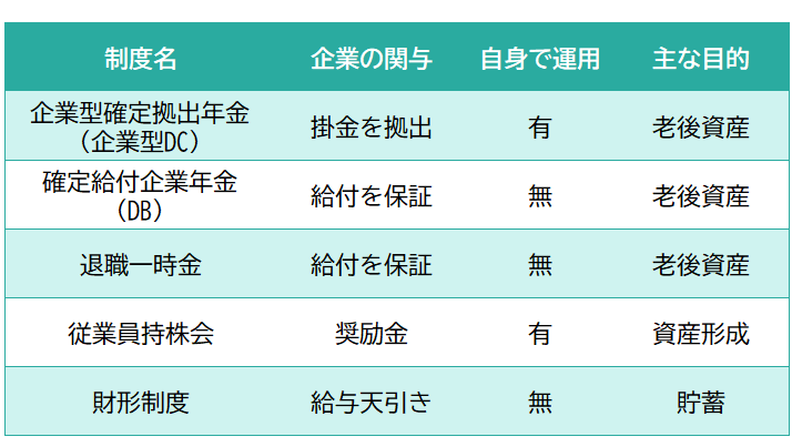 今回は、企業で用意されている代表的な資産形成制度を整理し、自身に合った活用方法のヒントをお伝えします(図表1)。