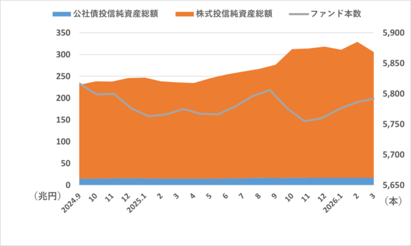 国内公募投資信託(以下、投信)の2026年3月末時点の純資産総額は305兆4,713億円(前月比24兆3,310億円減)となり、11カ月ぶりに減少に転じた。(2026年4月13日発表、資産運用業協会)。前月まで10カ月連続増加、9カ月連続過去最高を更新していた。