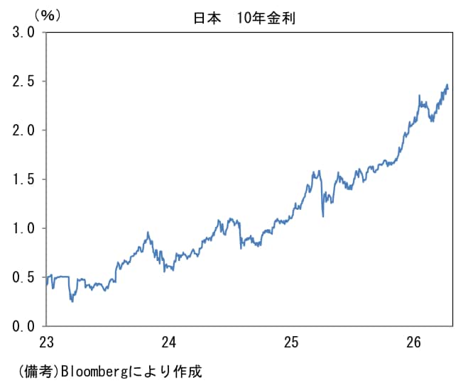 日本の10年金利は2.5%を視野に入れる水準まで上昇している。4月15日は2.423%となり、1990年代後半と同程度の水準に回帰した。上昇の基本的要因は日銀の利上げ観測であろう。その点、4月の金融政策決定会合(27-28日)まで約2週間となった現時点において、利上げを示唆する情報発信がほとんど出ていない状況を踏まえると、4月の利上げの可能性は低下したと判断される。逆に、利上げを見送るとの観測報道がほとんど出ていないことには不気味さを禁じ得ないが、4月13日に植田総裁(氷見野副総裁による代読)は「中東情勢がなお不透明な状況にあることを踏まえ、その帰趨や、それが経済・物価・金融情勢に及ぼす影響を注視しつつ」と発言していたことを踏まえれば、中東情勢に関連する「霧」が晴れるまで判断を先送りするのではないか。