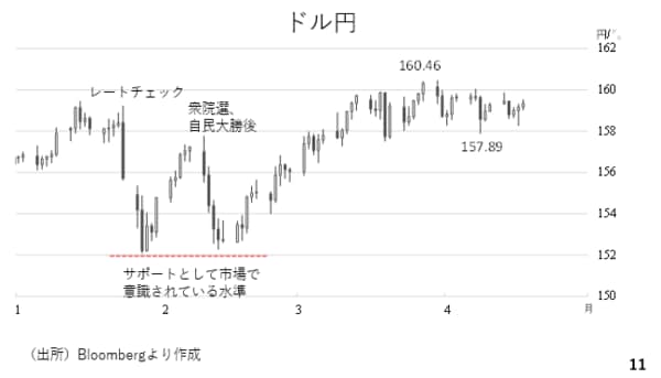 その場合、市場では152円が意識されそうです。1月下旬のレートチェック後、2月8日、自民党が大勝を収めた衆議院選挙後、それぞれドル円は大幅に下落しましたがどちらも152円台で下げ止まりました。この為、市場では152円台は強いサポートとみなされています。もっとも、仮にそこを下抜けした場合でも、ドル円が下落トレンドに転じるわけではないでしょう。