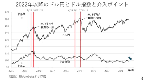 利上げが見送られた場合、ドル円は160円の大台を回復する可能性が高いでしょう。ただ、3月30日に三村財務官より「そろそろ断固たる措置が必要」との発言がきかれた通り、いつ円買い介入が入っても不思議ではありません。足元ではドル高がピークアウトしたタイミングだけに、日本の単独介入であってもドル円の下げ幅が広がる可能性に要注意です(スライド9)。