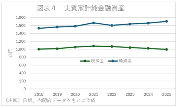 次に、金融資産の動向について確認する。金融純資産残高について、家計最終消費支出デフレーターにより実質化すると、2023年以降は物価上昇局面の中でも増勢が続いてきたことが分かる(図表4)。