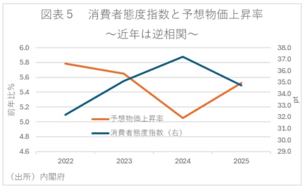 こうした可処分所得や金融純資産の動きに加えて、個人消費の動向に影響を及ぼしていると考えられる要因の一つが消費者マインドである。消費者マインドを示す指標である内閣府「消費動向調査」における消費者態度指数をみると、図表5のとおり、新型コロナウイルスからのリオープンなどもあって、2024年まで上昇傾向が続いていたが、2025年は低下に転じた。