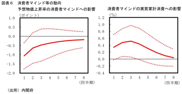 2025年に消費者マインドが低下した背景としては、主に、2024年秋頃以降、食料品など身近な品目の価格上昇が続く中で、家計の予想物価上昇率が高まったことがある。実際、内閣府が試算したVARモデルにより予想物価上昇率の消費者マインドへの影響(インパルス応答関数)をみると、予想物価上昇率の上昇は短期的に1四半期後の消費者マインドを▲1.0pt程度押し下げることが確認されており、予想物価上昇率の高まりが続いたことが、消費者マインドを継続的に押し下げてきたことが分かる(図表6)。そして、こうした消費者マインドの低下は、翻って個人消費を抑制する要因となる。実際、消費者マインドから個人消費への影響を内閣府が試算したインパルス応答関数からみると、消費者マインドの低下は、先行き1年近くにわたって平均0.4pt程度、個人消費を押し下げるということが確認される(図表6)。