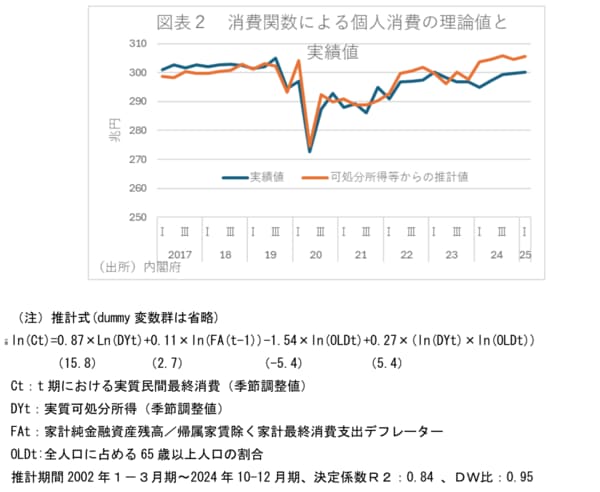 ここで、実質個人消費については、内閣府は令和7年度年次経済財政報告の中で、実質家計可処分所得や実質家計金融純資産、高齢化要因等により説明する回帰式を推計し、理論値と実績値の関係をみている(図表2)。これによると、2024 年の個人消費は、実質可処分所得等の要素により説明される理論値に比べると▲2.2%下振れして推移していることが分かる。