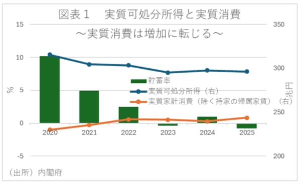 家計部門の支出のうちGDPの過半を占める個人消費について、GDP統計により帰属家賃を除く実質値の動向をみると、2025年の実質家計消費は前年比+1.7%と前年の同▲0.8%からプラスに転じた一方、マクロ的な家計貯蓄率はマイナスに転じている(図表1)。