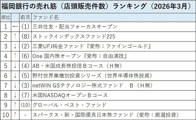 福岡銀行の売れ筋(店頭販売件数ランキング)の2026年3月は、トップが前月同様に「三井住友・配当フォーカスオープン」だった。第2位には前月第8位だった「ストックインデックスファンド225」がジャンプアップし、前月第2位だった「三菱UFJ純金ファンド(愛称:ファインゴールド)」は第3位に後退し、前月第3位だった「netWIN GSテクノロジー株式ファンド B(H無)」は第7位にまで下がった。また、前月第6位だった「One国内株オープン『愛称:自由演技』」が第4位に上がり、第4位だった「AB・米国成長株投信Bコース(H無)」は第5位に、第5位だった「野村世界業種別投資シリーズ(世界半導体株投資)」は第6位に下がった。そして、トップ10圏外から「スパークス・新・国際優良日本株ファンド(愛称:厳選投資)」が第10位にランクインした。