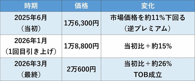 最初に提示された買付価格は1株1万6,300円だった。ところがそこから約9カ月、価格は2度にわたって引き上げられ、最終的には2万600円で決着した。当初比で26%の上昇だ。