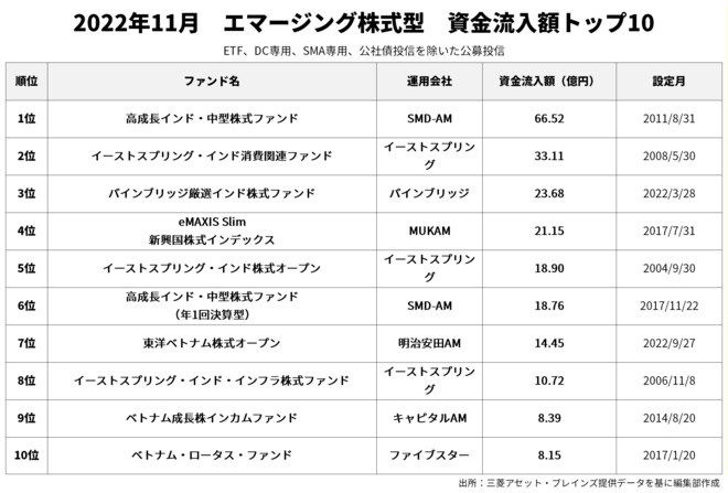 11月の資金流入額1位は「高成長インド・中型株式ファンド」(66.52億円)