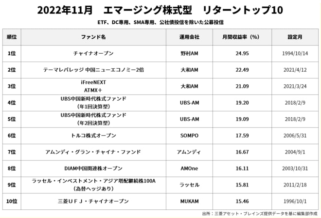エマージング株式ファンドの11月リターン1位は、「チャイナオープン」だった。同ファンドは中国および香港企業の株式(DRおよびカントリーファンドを含む)を主要投資対象とするアクティブファンドである。11月は+24.9%の高いリターンになった。ただ、1年騰落率は-34.6%となっており、基準価額の変動が激しい。短期間で高いリターンが狙えるものの、リスクが高いファンドだという認識が必要だ。