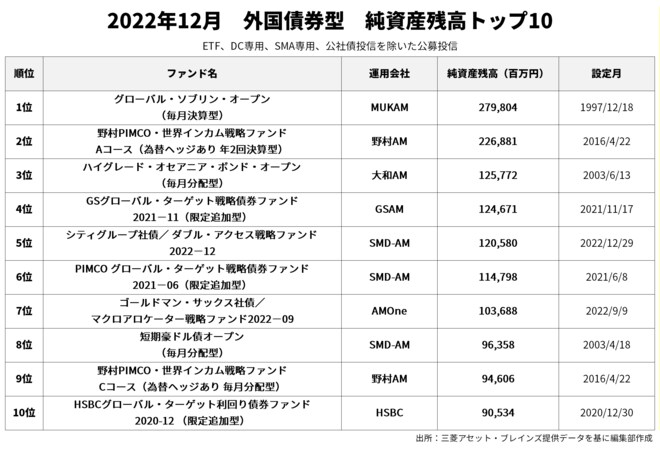 12月の純資産残高1位は「グローバル・ソブリン・オープン(毎月決算型)」(2798.04億円)