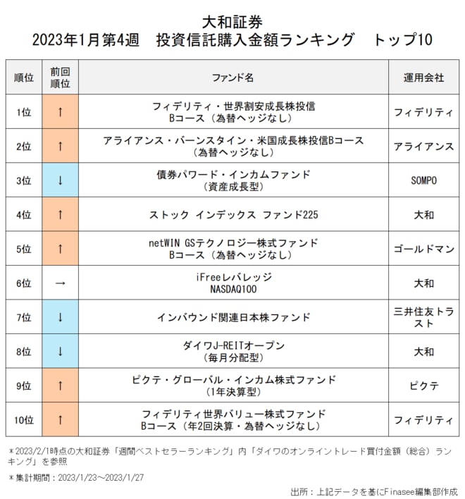 大和証券 人気ファンドランキング トップ10(2023年1月第4週)