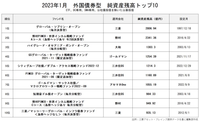 1月の純資産残高1位は「グローバル・ソブリン・オープン(毎月決算型)」(2806.94億円)