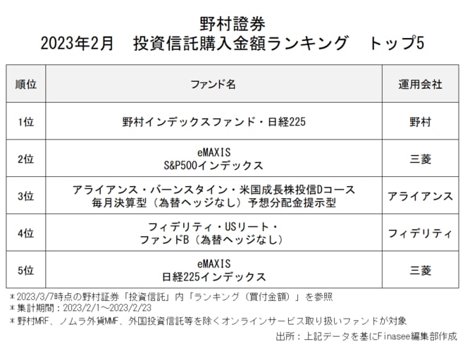 野村證券 人気ファンドランキング トップ5(2023年2月)