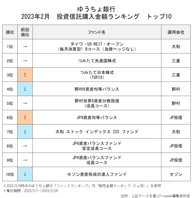 ゆうちょ銀行 人気ファンドランキング トップ10(2023年2月)