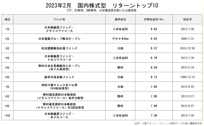 2月のリターン1位は「日本株厳選ファンド・メキシコペソコース」(9.82%)