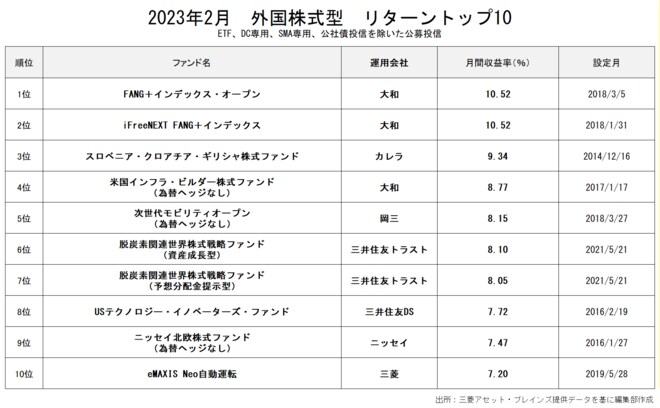2月のリターン1位は「FANG+ インデックス・オープン」(10.52%)