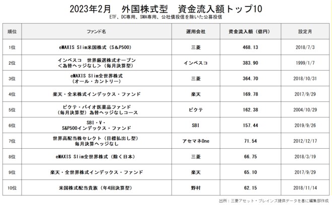 2月の資金流入額1位は「eMAXIS Slim 米国株式(S&P500)」(468.13億円)
