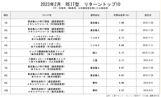 2月のリターン1位は「東京海上J-REIT投信(通貨選択型)メキシコペソコース(年2回決算型)」(7.68%)