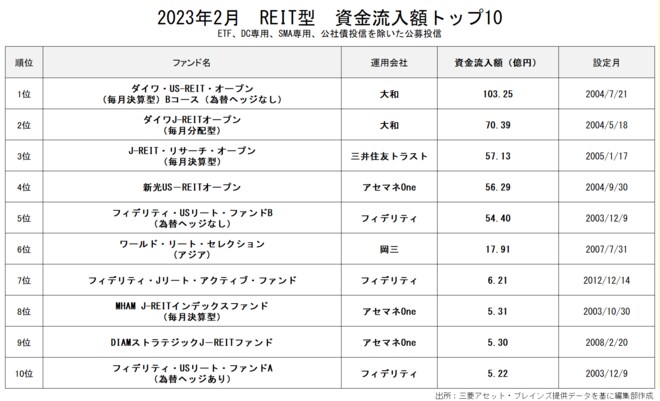 2月の資金流入額1位は「ダイワ・US-REIT・オープン(毎月決算型)Bコース(為替ヘッジなし)」(103.25億円)