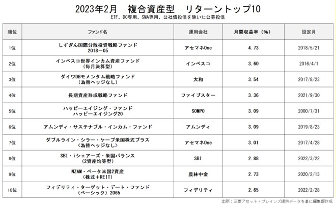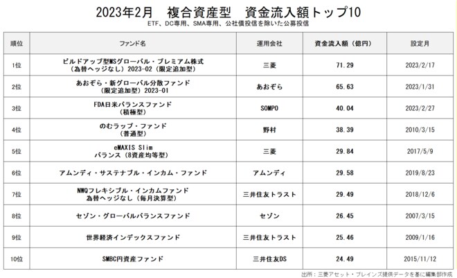 【投資信託 複合資産型】資金流入額・リターン・純資産残高ランキング トップ10ファンド(2023年2月)