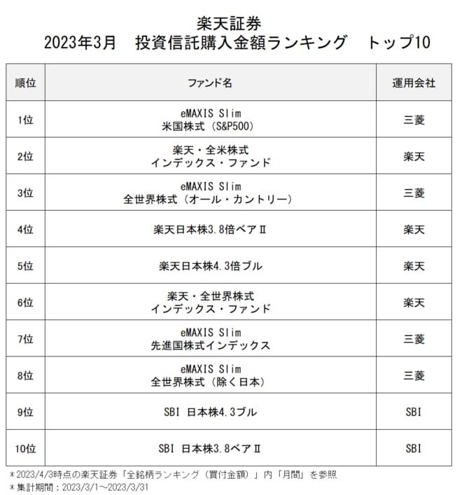 楽天証券 人気ファンドランキング トップ10(2023年3月)