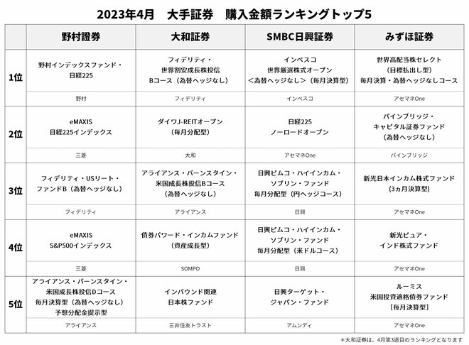 市場や業界の動向を踏まえ、金融機関が毎月公表するランキングデータについて、トップファンドの概要やポイントを解説するシリーズ「Finaseeファンドウォッチ」。本記事では、大手証券(野村證券・大和証券・SMBC日興証券・みずほ証券)の2023年4月の販売金額ランキングについて見ていきます。