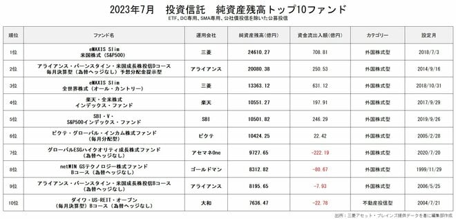 同ファンドは、マイクロソフトやアマゾン・ドット・コムなどの米国ハイテク株を中心に投資するアクティブファンドである。7月は約250億円の資金流入となった。3月までは基準価額の下落から分配金がでなくなり資金流出が続いていたが、4月から100円、6月から200円の分配金がでている。7月末時点における1年騰落率は+17.6%と好調で、8月以降も資金流入が続く可能性は高いだろう。