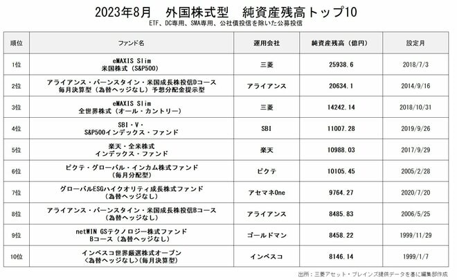 「eMAXIS Slim 米国株式(S&P500)」の8月末時点における純資産残高は 2兆5938.60億円となり、国内公募株式投資信託(ETF除く)の中で首位をキープした。8月末時点における1年騰落率は+21.1%とパフォーマンスも好調である。9月以降も純資産残高を増やす可能性は高いだろう。