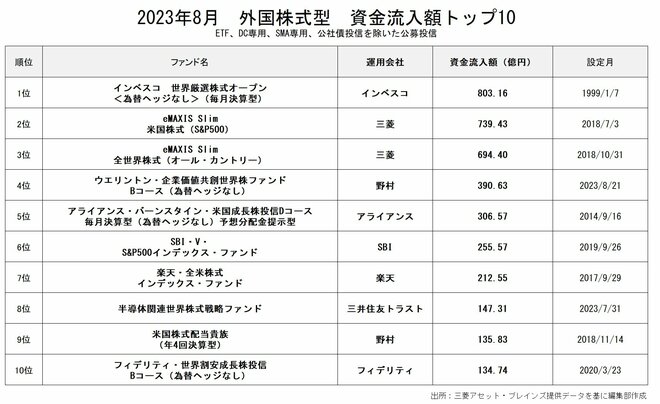 外国株式型の8月資金流入額1位は、「インベスコ 世界厳選株式オープン<為替ヘッジなし>(毎月決算型)」の803.16億円だった。同ファンドは株式投資の王道である「成長+配当+割安」を追求して世界のベスト銘柄を厳選するアクティブファンドである。20年以上の実績があり、8月末時点における1年騰落率も+31.23%と好調だ。9月以降も高水準の資金流入が続く可能性は高いだろう。