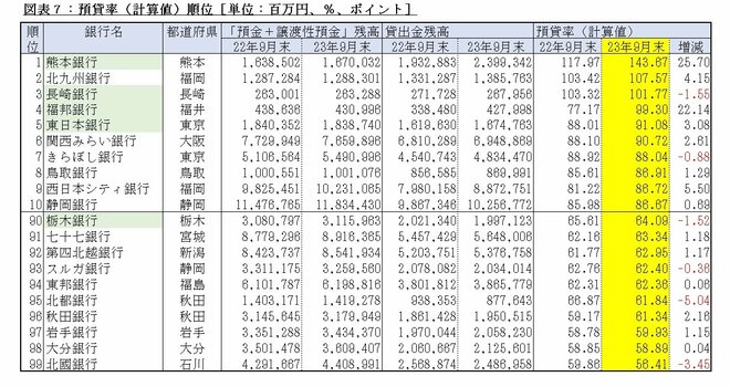 下位の顔触れでは、第91位から第99位までを地方銀行が占めた。そのうち5行を東北財務局管内の地方銀行が占め、過疎化に悩む地方部の経済情勢を反映した形となった。