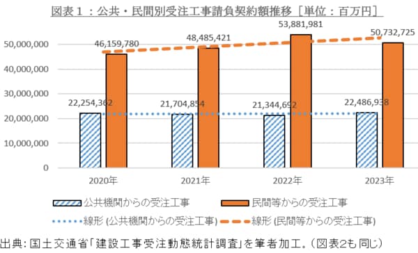 そんな経緯が認められ、2019年以前と2020年以降の数値に水準差も認められることから、2020年からの公共・民間の動きを捉えてみた[図表1]。