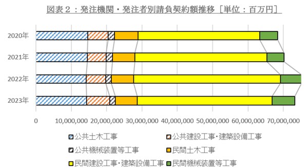 このため、さらに公共工事の目的や民間工事の発注者・工事種類を掘り下げてみた[図表2]。
