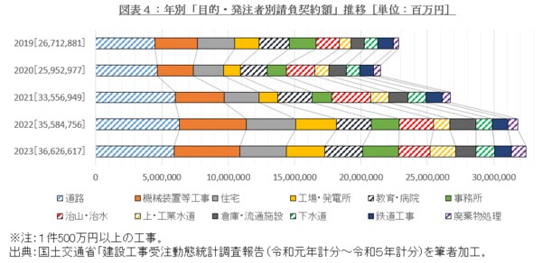 次に、その影響を考察したい。建設業者が請け負う工事の種類は、自宅の棚取付けから海底トンネルの掘削などまで幅広く、期間も、60分以内のものから数十年単位にまで及ぶ。それゆえにデータも膨大だが、本稿では、図表1・2同様に、目的別の工事金額の切り口から捉えてみたい。