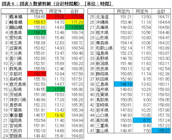棒グラフでは細かい数値が伝え切れないため、別途、数値明細を作成し、「所定内」「所定外」「合計」各々の第1位に赤、第2位に黄、第3位に緑、最下位に青の着色を行った[図表6]。