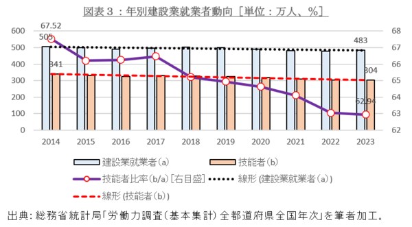 その前提での技能者数は、2014年の341万人が2023年には304万人になるなど、9年で1割以上減少した。この結果、就業者総数に占める比率も67%台から62%台にまでほぼ一貫して減少し続けた。